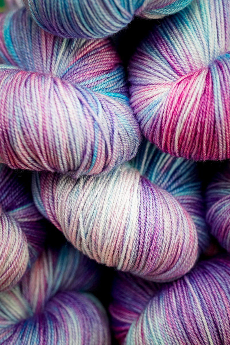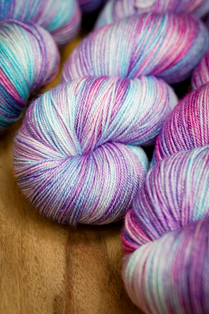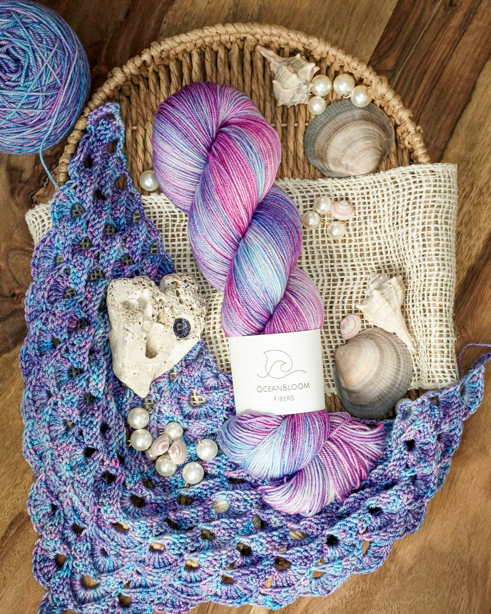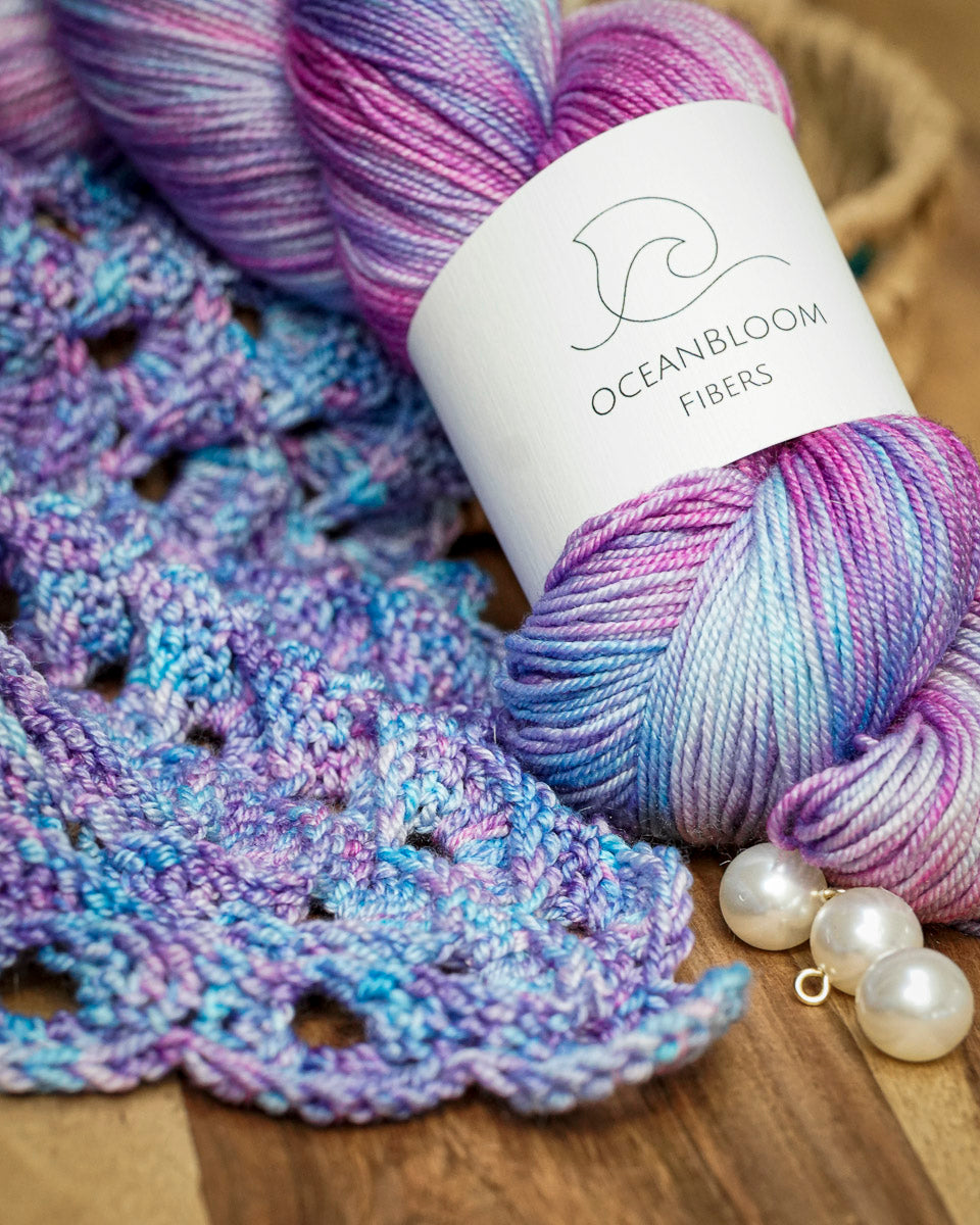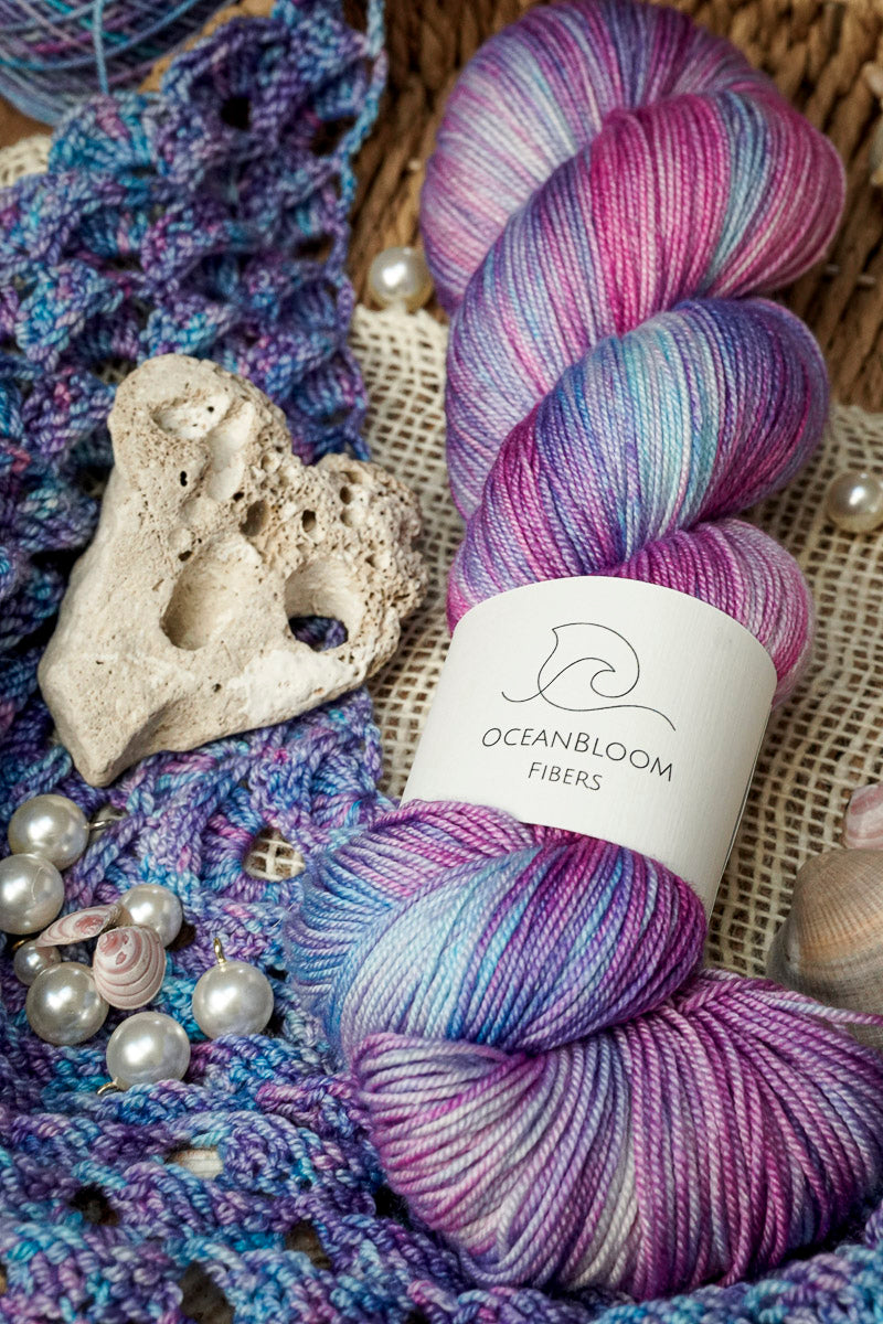 Dieses Garn vereint schimmernde Violett- und Rosétöne mit kühlen Blauakzenten – wie ein Sonnenuntergang über dem Meer, gespiegelt auf der Haut einer Meerjungfrau. Sanfte Farbverläufe und feine Nuancen erinnern an Licht, das langsam im Wasser versinkt.