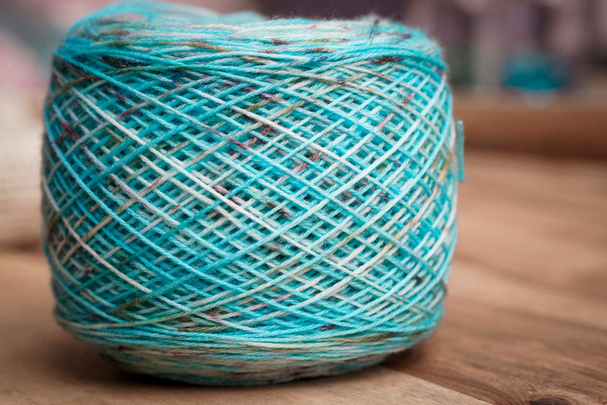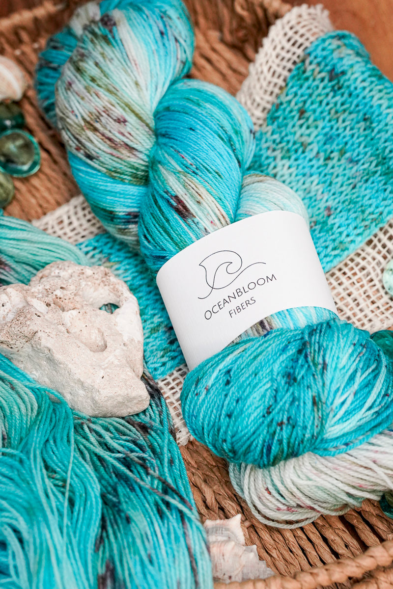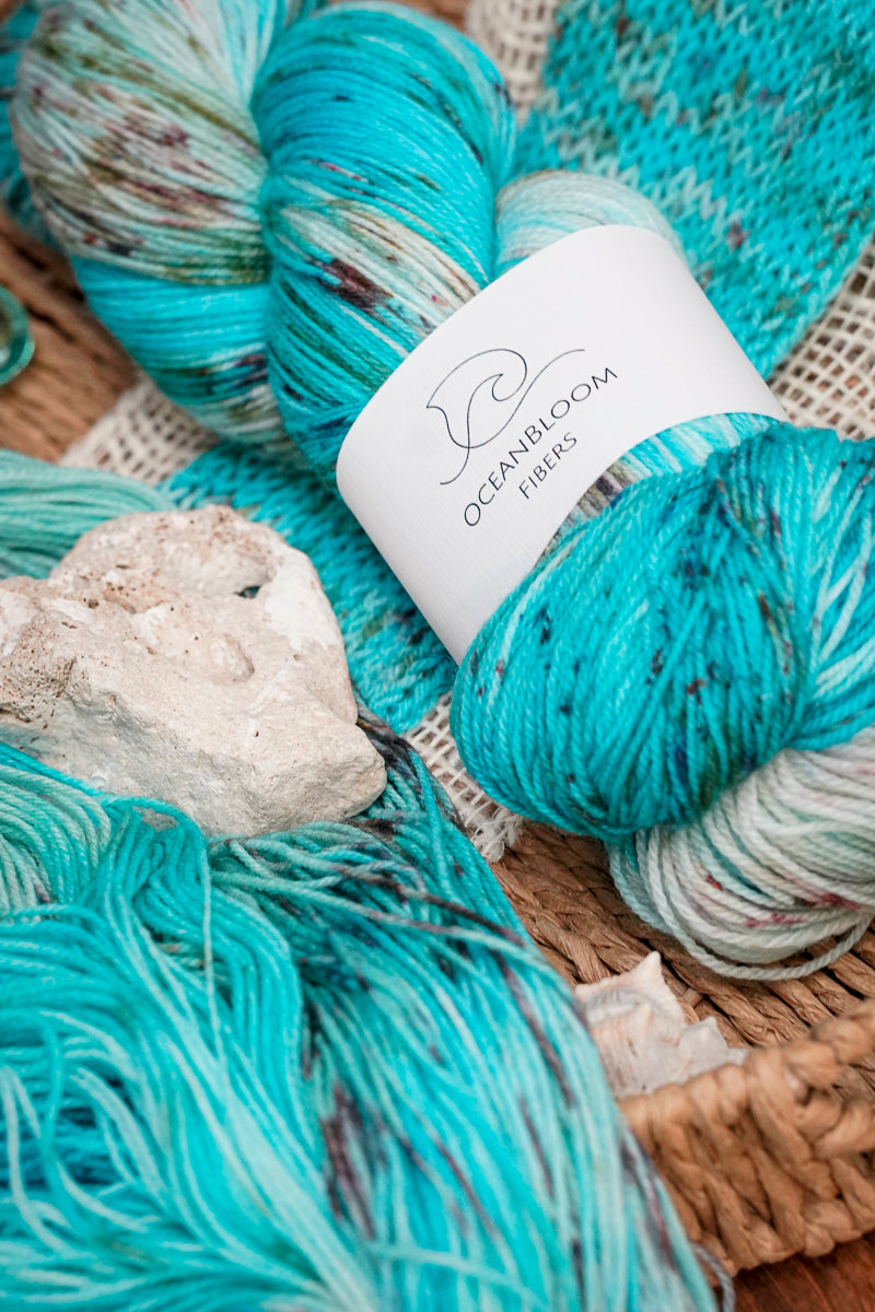 Dieses Garn erinnert an das schimmernde Farbspiel des Great Barrier Reefs. Leuchtendes Türkis, helle Aquatöne und feine, korallenartige Sprenkel fließen ineinander wie Licht, das durch klares Wasser auf ein lebendiges Riff fällt.